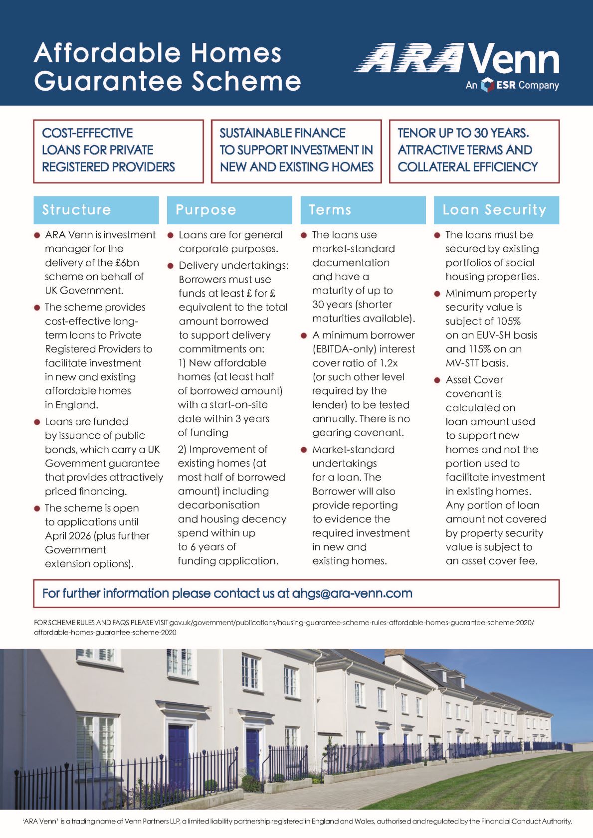 In 2020 UK Government announced that Venn would act as delivery partner to manage a new Affordable Homes Guarantee Scheme, following AHGS 2013. The scheme is for £6 billion, with a deadline to apply by 30 April 2028.